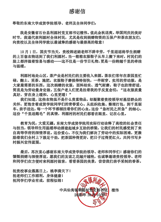 近日,我校收到一封来自安徽省石台县利源村村委会的感谢信,信中对制药与化学工程学院师生送来的爱心捐赠致以诚挚谢意,字里行间满溢温暖与感动。