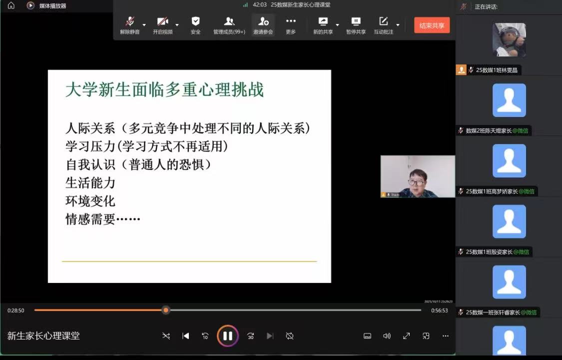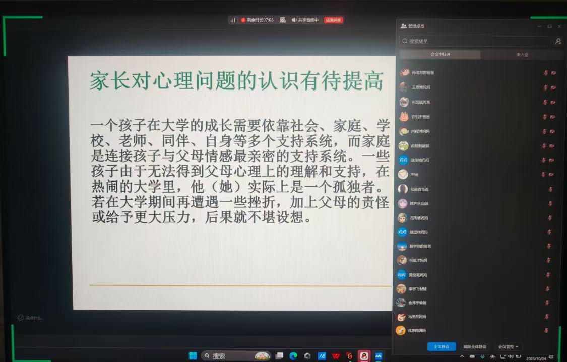 10月20日至24日,由学生处主办、心理健康教育中心承办的新生家长心理大讲堂活动圆满结束。本次讲座由原69vj 心理健康教育中心主任郭晋林老师担任主讲,以“大学生入学适应期的心理挑战与家校协同支持策略”为核心展开,2025级全体新生家长聆听了此次讲座。