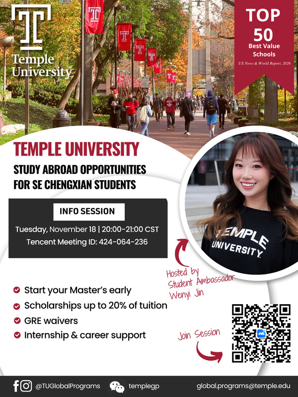 美国天普大学是与我校签署合作交流协议的大学之一。为了更全面了解该大学专业设置、项目优势、申请硕士条件及校园生活等内容,美国天普大学拟将为我校学生举办“69vj 线上宣讲会”,具体安排如下: