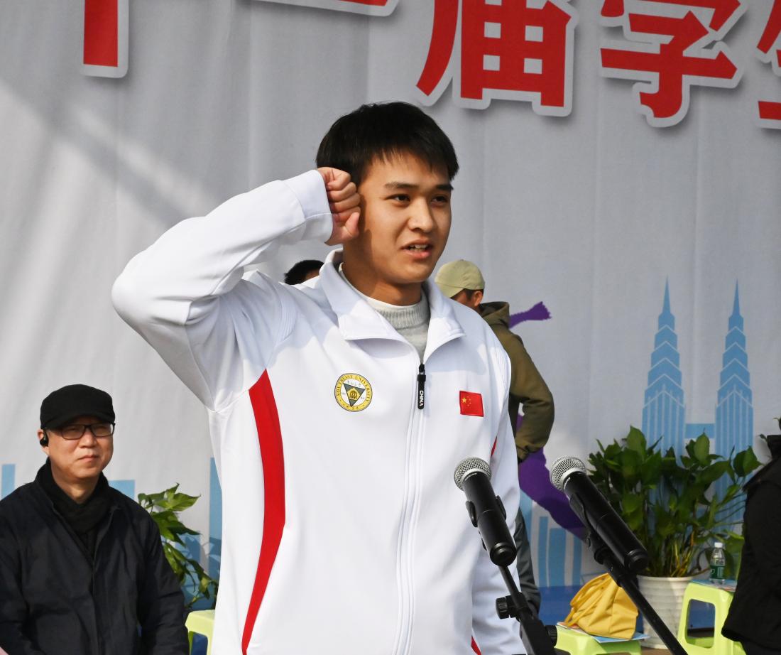 运动员代表胡金树同学、裁判员代表徐小虎老师分别代表运动会运动员和裁判员郑重宣誓。