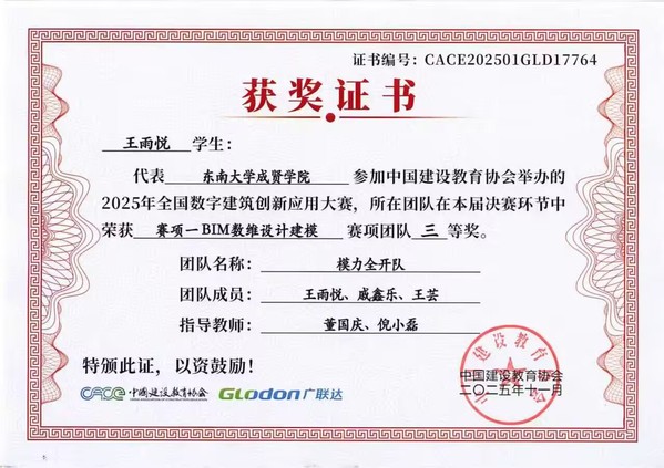 在第十七届全国数字建筑创新应用大赛中,我校土木与交通工程学院传来捷报。由工程造价、工程管理专业学生王雨悦、戚鑫乐、王芸与温慧灵、孙苗、倪馨悦组成的两支队伍,在董国庆、倪小磊老师的指导下发挥出色,最终双双荣获全国三等奖。