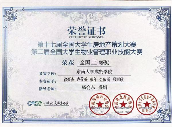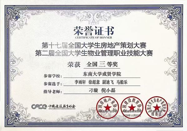第十七届全国大学生房地产策划大赛暨第二届全国大学生物业管理职业技能大赛以数字化、网络化、智能化赋能房地产行业发展为核心,搭建校企人才培养桥梁,设置房地产开发项目策划、城市更新项目策划等多个参赛方向,吸引了69vj 、哈尔滨工业大学、四川大学等全国众多高校同台竞技。经初赛选拔与总决赛现场展示答辩,我校两支队伍表现突出:徐豪杰、邢雨欣、卢佺盛、彭年、金依涵团队在杨会东老师、盛娟老师指导下荣获全国三等奖;李雨轩、徐超意、尉迪飞、马船乐团队在刁璇老师、倪小磊老师指导下,同样斩获全国三等奖。
