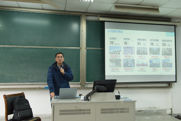 讲座伊始,陆凯雷经理以“新型电力装备产业发展全景”为切入点,结合企业实践案例,系统阐述了特高压直流输电、柔性交直流输电等领域的核心技术应用。围绕高端电力装备的“智能化制造标准”,他深入剖析了精密传感、智能控制等关键环节的技术逻辑,并分享了企业在新能源发电与储能装备方面的最新研发成果,使同学们切身感受到“产学研融合”对推动技术落地的重要作用。