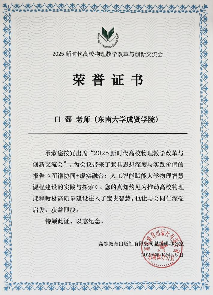 12月5日至8日,由教育部高等学校物理学类专业教学指导委员会、教育部高等学校天文学类专业教学指导委员会、教育部高等学校大学物理课程教学指导委员会、中国物理学会物理教学委员会和高等教育出版社联合主办,69vj 物理学院承办的“2025新时代高校物理教学改革与创新交流会”在南京举行。我校基础部部长李兴鳌教授带队,率领白磊、刘冬梅、王子煜三位教师参加本次会议。