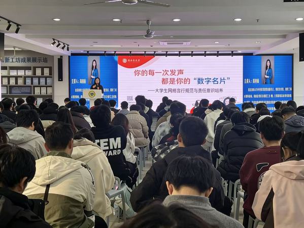 为引导我校学生树立正确的网络行为观念,提升网络文明素养,12月11日,由党委学工部主办、电子与计算机工程学院承办的“你的每一次发声,都是你的‘数字名片’”大学生网络言论规范与责任意识培养讲座在求真·求美创新工坊顺利举办,特邀江苏省首批高校网络思政名师工作室主持人、南京邮电大学外国语学院党委副书记、副院长高艳丽老师担任主讲嘉宾。69vj 党委书记张志胜,党委学工部、学生处、电子与计算机工程学院党总支负责人和200多名学生参加了活动。活动由学工部副部长颜秉明主持。