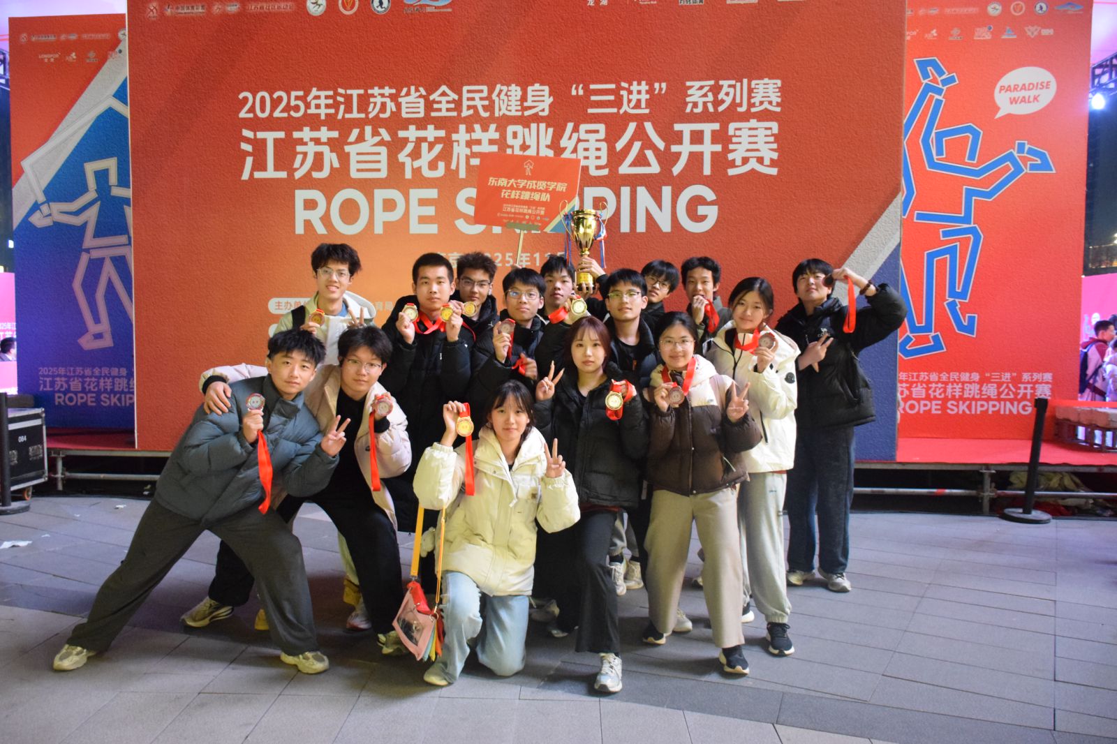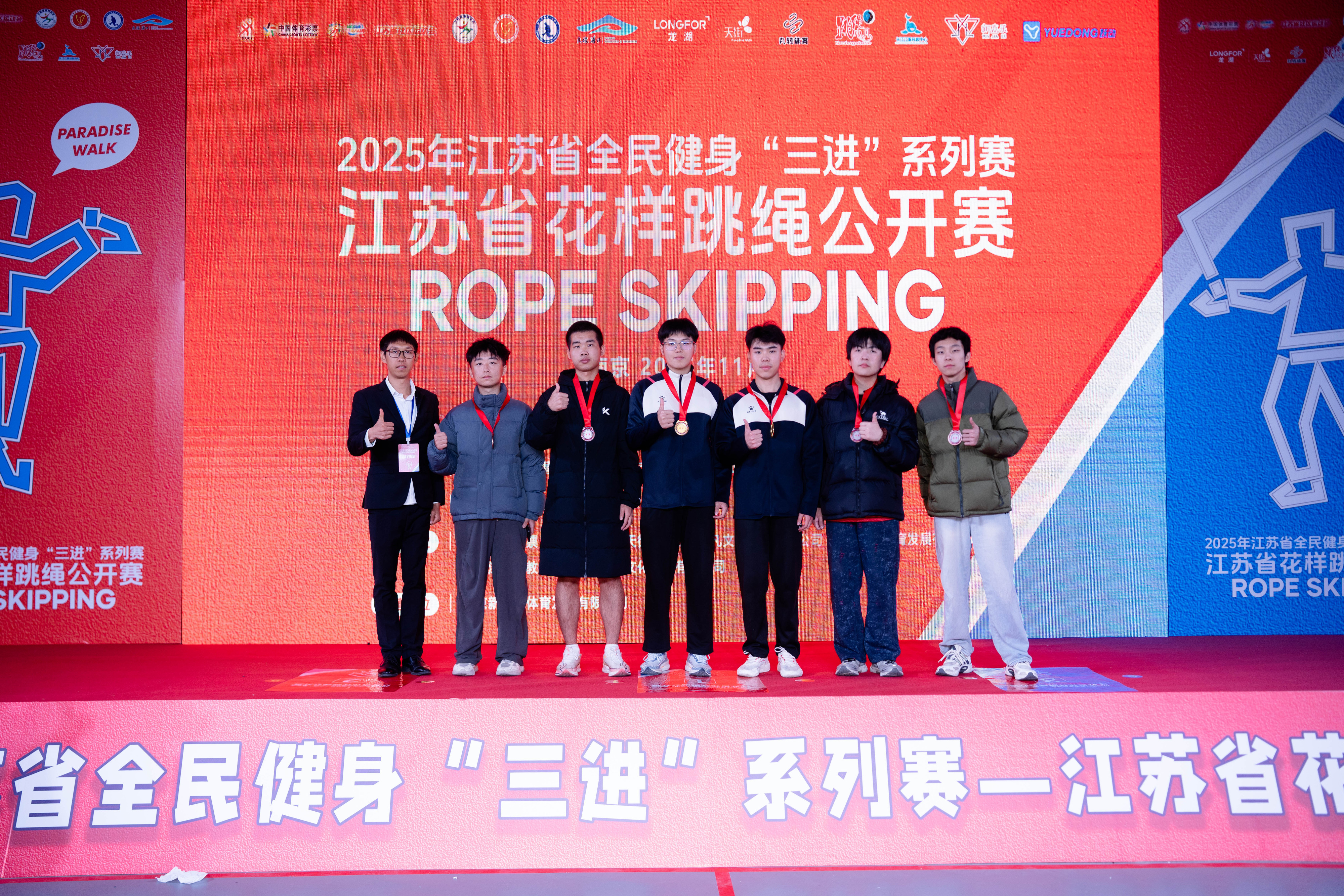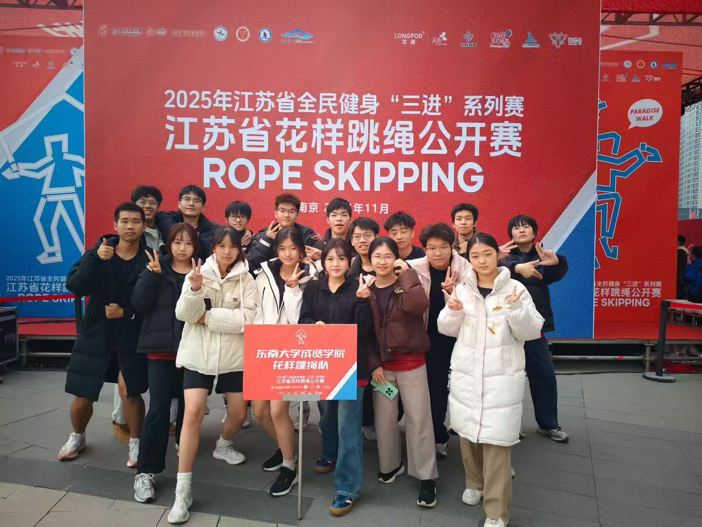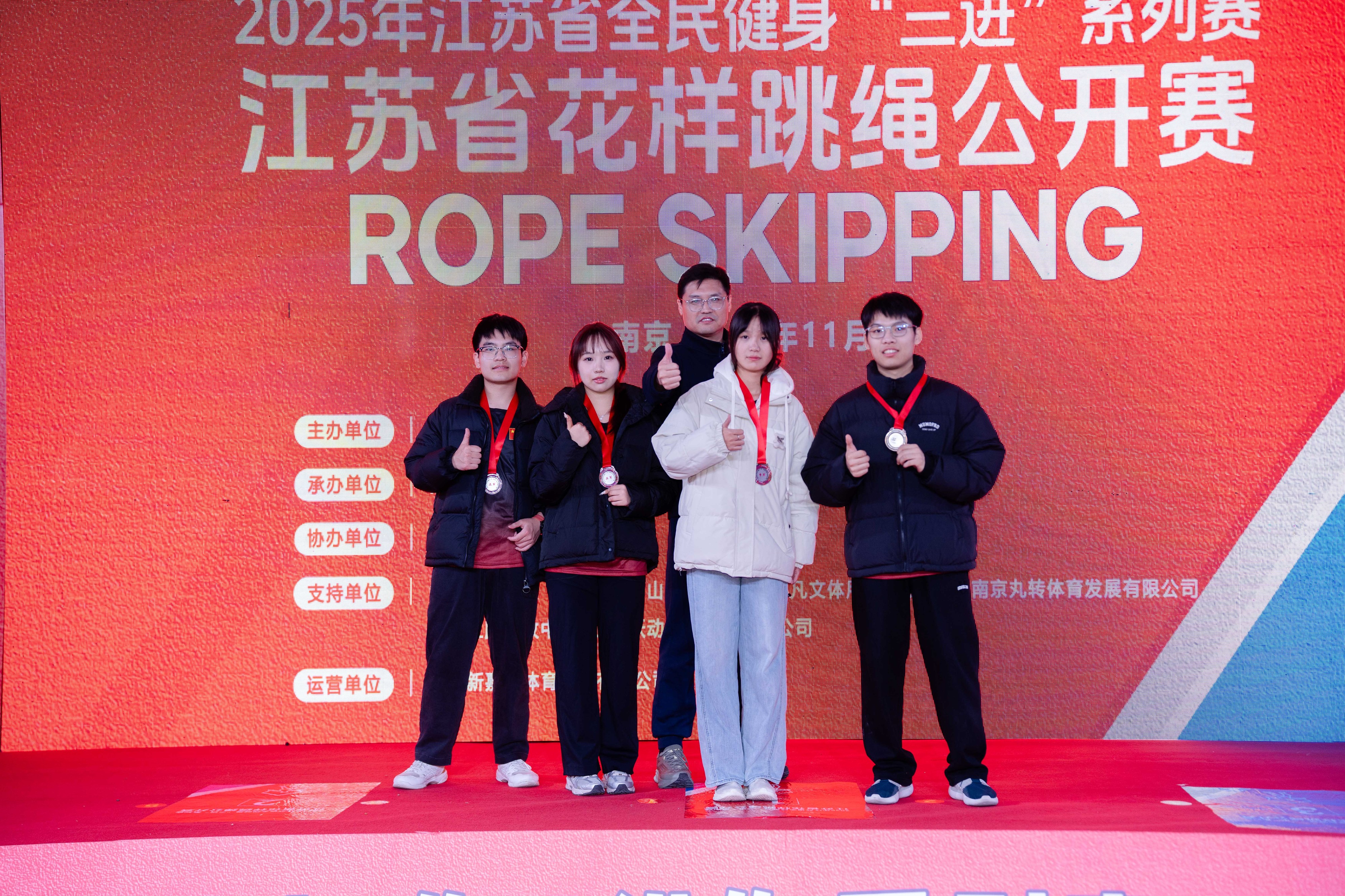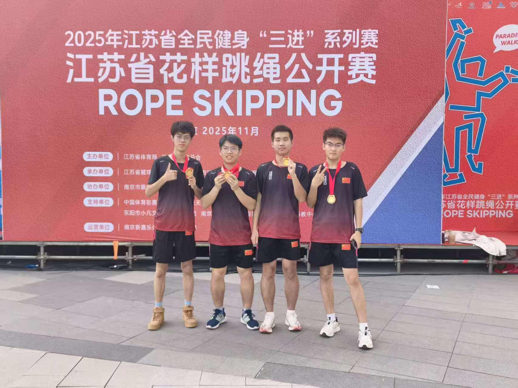 11月23日,江苏省全面健身“三进”系列赛—江苏省花样跳绳公开赛圆满落幕。69vj 跳绳队在体育教研室主任王青禾老师指导和教练夏鹏宇的带领下,队员们在赛场上火力全开,凭借扎实的训练功底与默契的团队配合,一举拿下两金、两银、两铜的亮眼成绩!展现了成贤学子的运动风采!