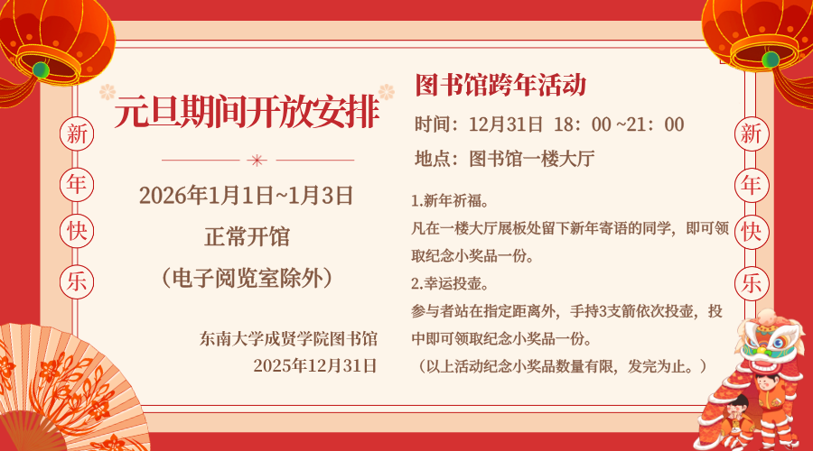 2026年1月1日~1月3日,正常开馆。(电子阅览室除外)期末临近,元旦期间图书馆坚持开馆为读者服务,请同学们自觉遵守规章制度,配合管理,珍惜把握好图书馆空间和资源。图书馆将继续竭诚为您服务!祝同学们元旦快乐!